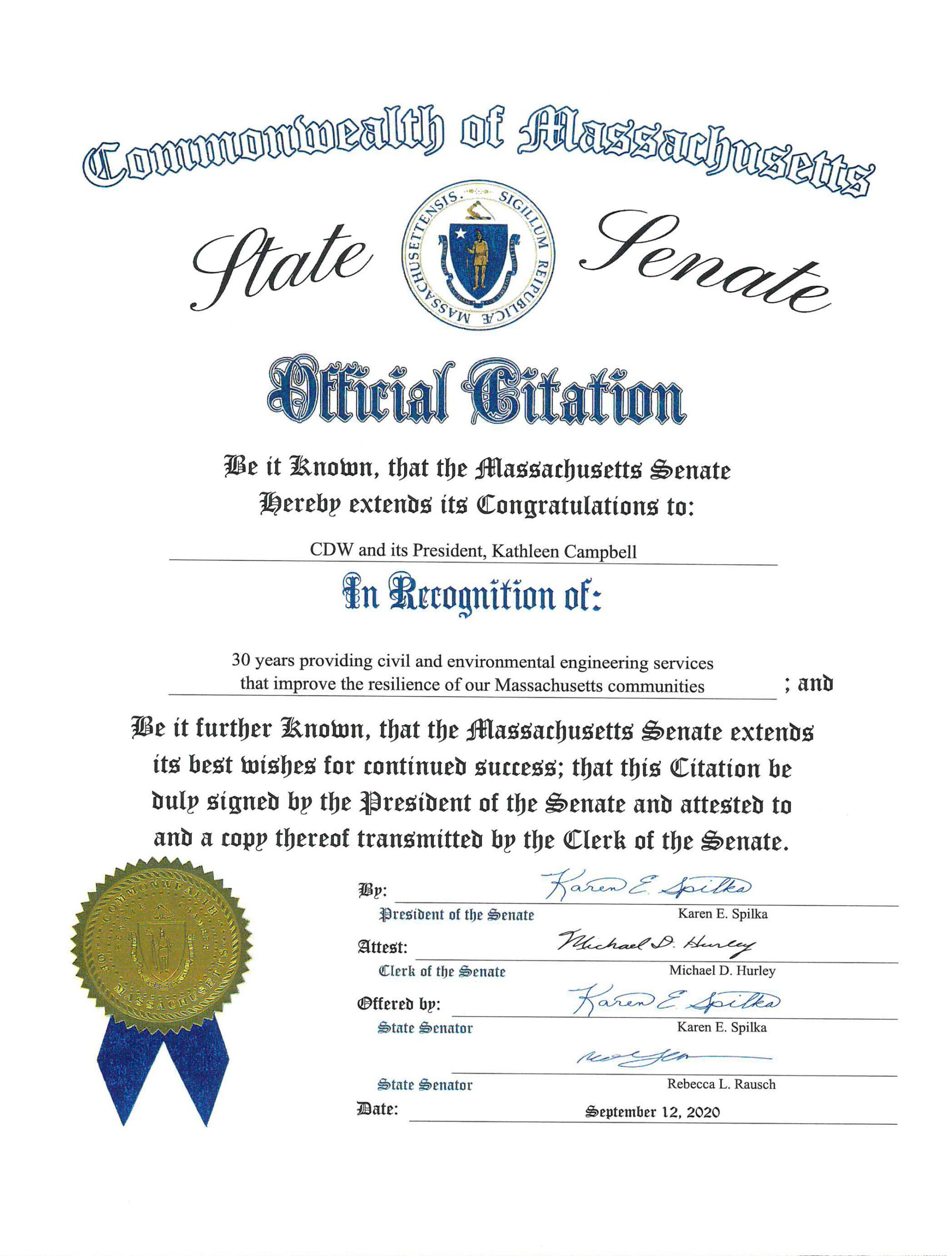 We're pleased to announce the launch of our new logo and website. Thank you to the Commonwealth of Massachusetts and President of the Senate Karen E. Spilka for helping us celebrate. The Citation reads -- In Recognition of 30 years providing civil and environmental engineering services that improve the resilience of our Massachusetts communities.